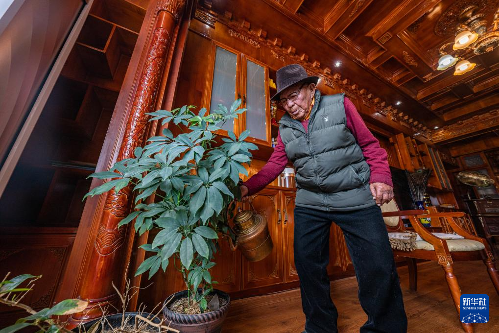 洛桑老人在家中澆綠植(3月20日攝)。新華社記者 丁增尼達(dá) 攝