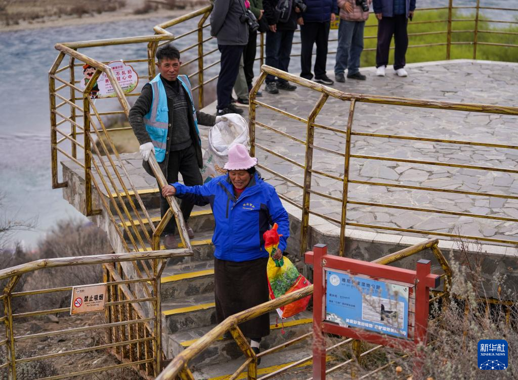 4月4日,雅尼國家濕地公園管護(hù)員在巡護(hù)途中清理垃圾。新華社記者 丁增尼達(dá) 攝