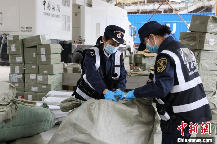 圖為聶拉木海關(guān)關(guān)員對出口貨物進(jìn)行查驗。拉薩海關(guān)供圖
