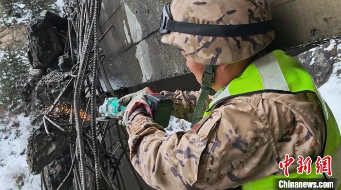 4月26日14時,武警官兵抵達然烏棚洞災害現(xiàn)場,立即協(xié)助交警部門對受災路段實施管控,并協(xié)調(diào)地方力量展開清理工作。由于棚洞頂部垂吊物夾雜鋼筋,機械難以徹底清除,武警官兵使用切割機對鋼筋進行精準切割,加快搶通進度。