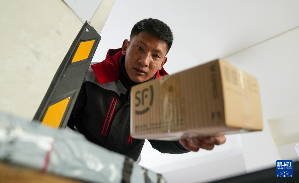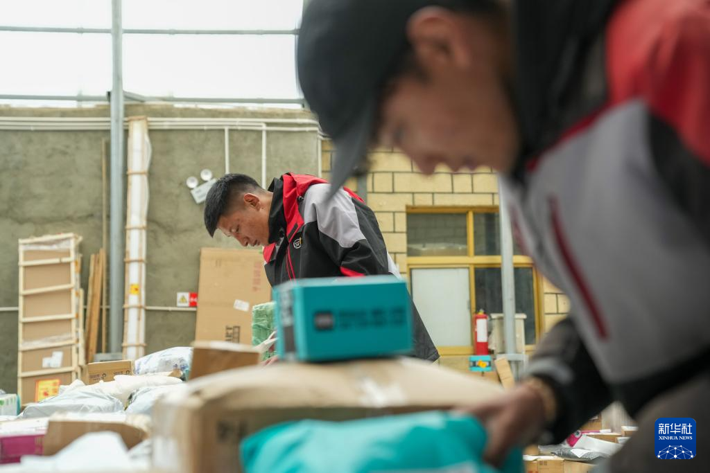 拉巴在站點內(nèi)整理快遞(4月24日攝)。新華社記者 晉美多吉 攝