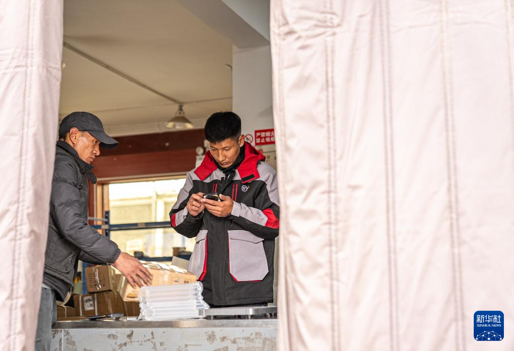 拉巴(左)在站點內(nèi)查看快遞信息(4月24日攝)。新華社記者 晉美多吉 攝