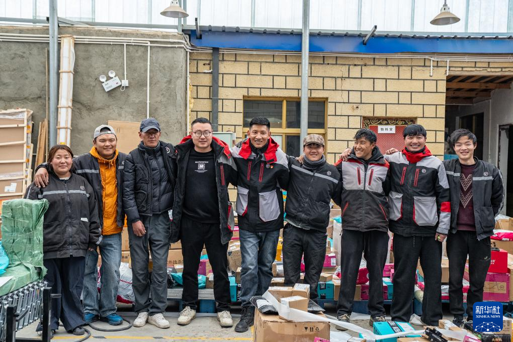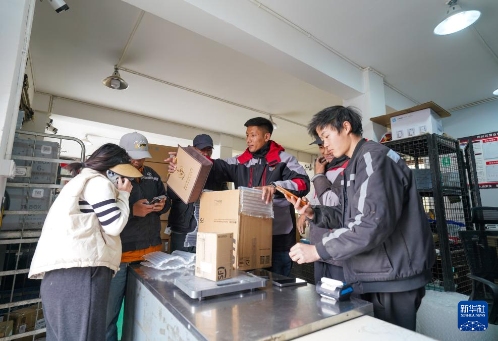 拉巴(左四)在站點內(nèi)打包快遞(4月24日攝)。新華社記者 晉美多吉 攝