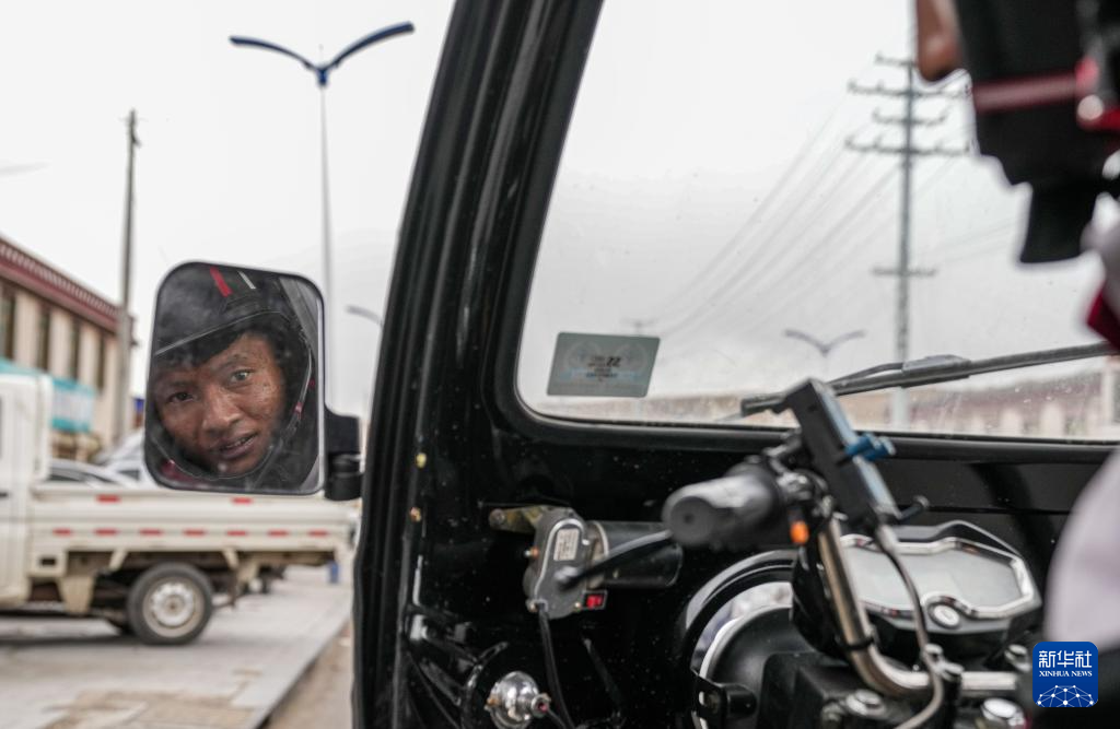 拉巴準備去派件,他通過后視鏡檢查路況(4月24日攝)。新華社記者 晉美多吉 攝