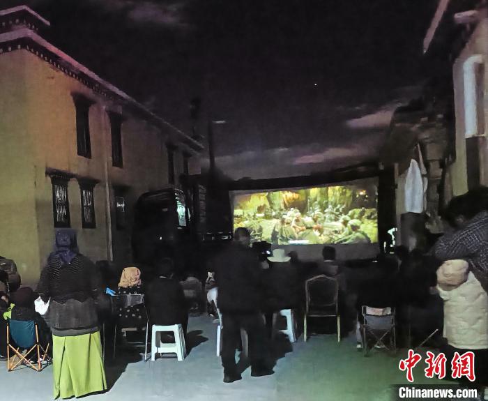 圖為村民在夜幕下觀看露天電影。達(dá)孜區(qū)委宣傳部供圖