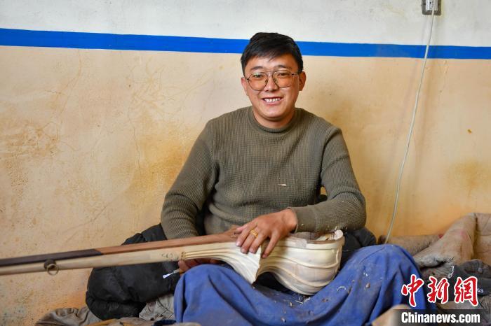 圖為熱薩村村民白瑪塔木曲為扎念琴上色。貢確 攝