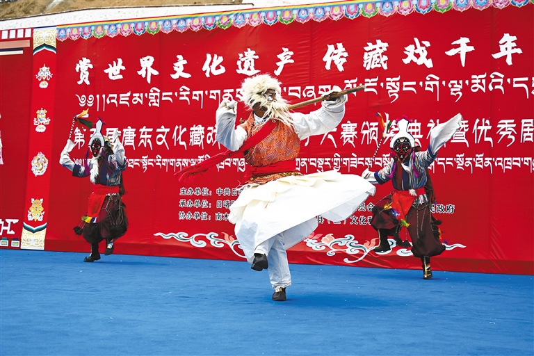 第五屆唐東文化藏戲(折子戲)大賽決賽上,參賽隊(duì)伍正在表演。