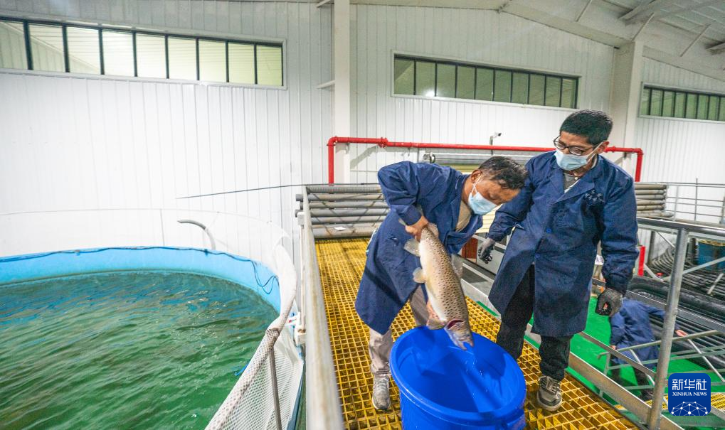 工作人員在查看亞?wèn)|鮭魚長(zhǎng)勢(shì)(6月19日攝)。新華社記者 丁增尼達(dá) 攝