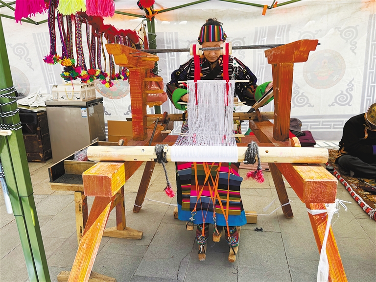 在措美縣非遺展示活動現場,扎雜村村民在演示織氆氌。