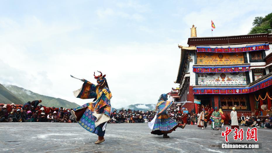 近日,西藏自治區(qū)拉薩市墨竹工卡縣直孔替寺舉行中國國家級(jí)非物質(zhì)文化遺產(chǎn)直孔嘎爾羌姆(跳神)活動(dòng)。直孔嘎爾羌姆是藏傳佛教重要的宗教舞蹈藝術(shù)形式,“嘎爾”意為“樂舞”。其表演具有規(guī)范化的舞蹈動(dòng)作、獨(dú)特的伴奏音樂和完整的儀軌流程。圖為西藏拉薩市墨竹工卡縣直孔替寺僧人們佩戴面具參加跳神活動(dòng)。