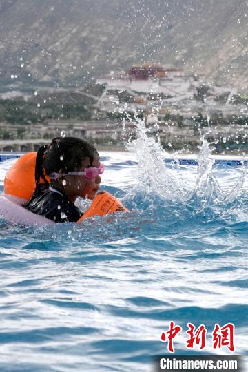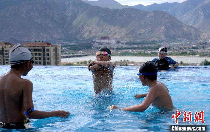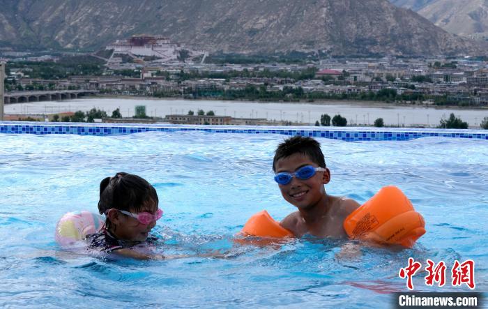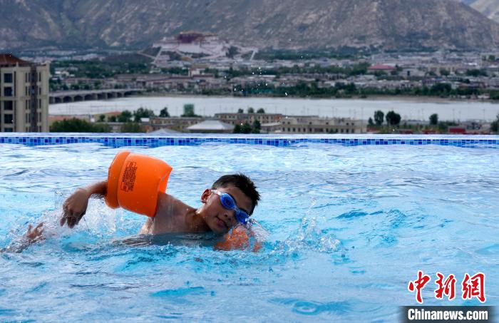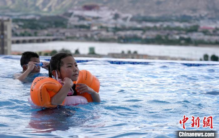 7月5日,西藏拉薩市一泳池內(nèi),不少市民帶著孩子來到泳池戲水,享受夏日清涼。圖為小朋友在泳池里游泳。中新社記者 李林 攝