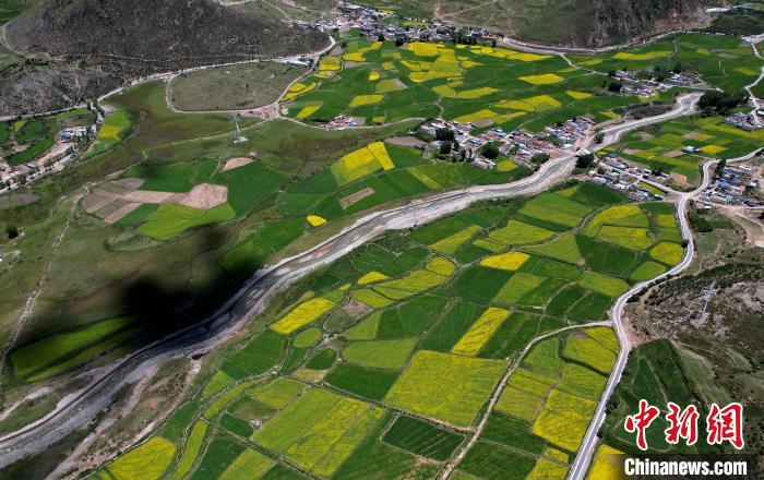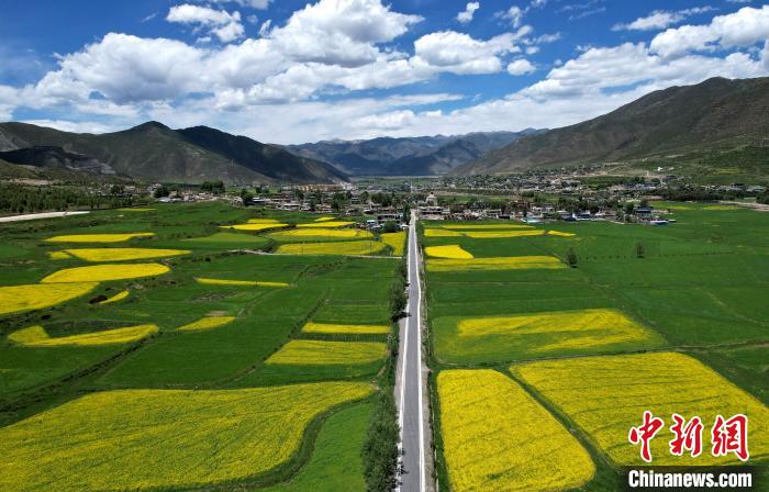 7月5日,西藏拉薩市墨竹工卡縣油菜花盛放。無(wú)人機(jī)航拍視角下,一塊塊金黃的油菜花田猶如大地的調(diào)色板,風(fēng)光宜人。(無(wú)人機(jī)照片)中新社記者 李林 攝