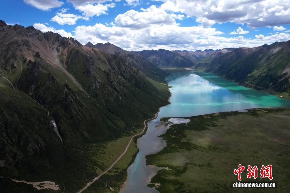 7月21日,嘉乃玉錯(cuò)景色。嘉乃玉錯(cuò)國(guó)家濕地公園位于西藏那曲市嘉黎縣境內(nèi)。夏日,嘉乃玉錯(cuò)碧波蕩漾,湖邊綠意盎然,在藍(lán)天白云映襯下,景色如畫。(無人機(jī)照片)中新社記者 李林 攝