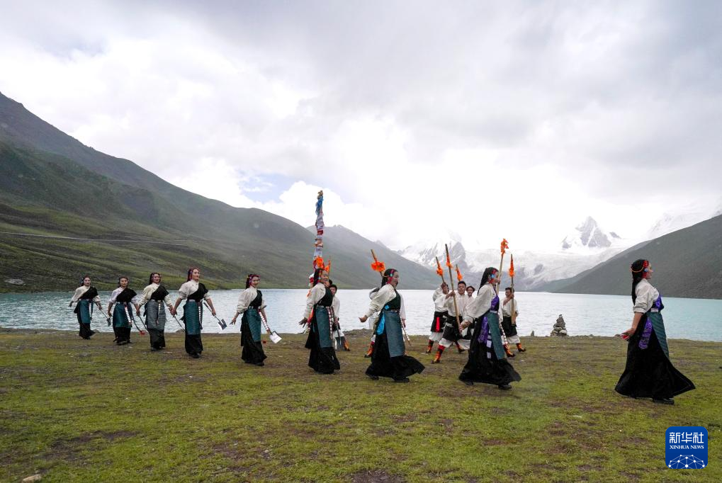 西藏那曲市比如縣藝術(shù)團(tuán)的演員在薩普雪山景區(qū)為游客表演(7月19日攝)。新華社記者 晉美多吉 攝