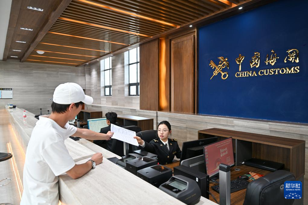 7月16日,日喀則國際陸地港出口貨物查驗場的海關關員為貨車司機辦理報關手續(xù)。新華社記者 李鑫 攝
