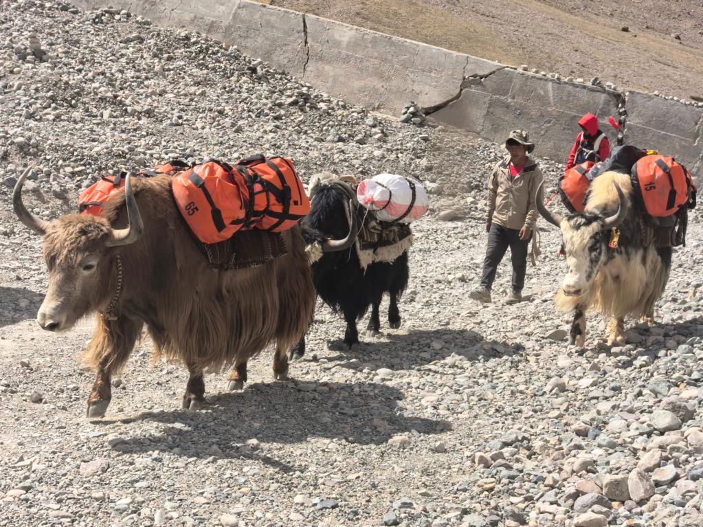 在徒步路線的起點廣場上,一隊隊牦牛隊整裝待發(fā),游客的行李正被穩(wěn)穩(wěn)地放上牛背。不少外籍游客雇傭本地牧民,利用牦牛馱運行李并提供向導服務。陳賢剛介紹,旅游業(yè)已成為巴嘎鎮(zhèn)經(jīng)濟的主導產(chǎn)業(yè),當?shù)鼐用袷杖胫屑s一半來自旅游相關工作。