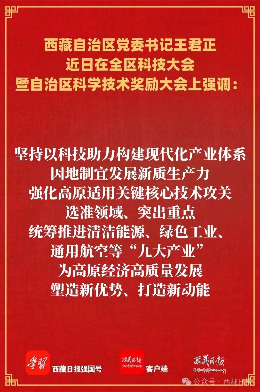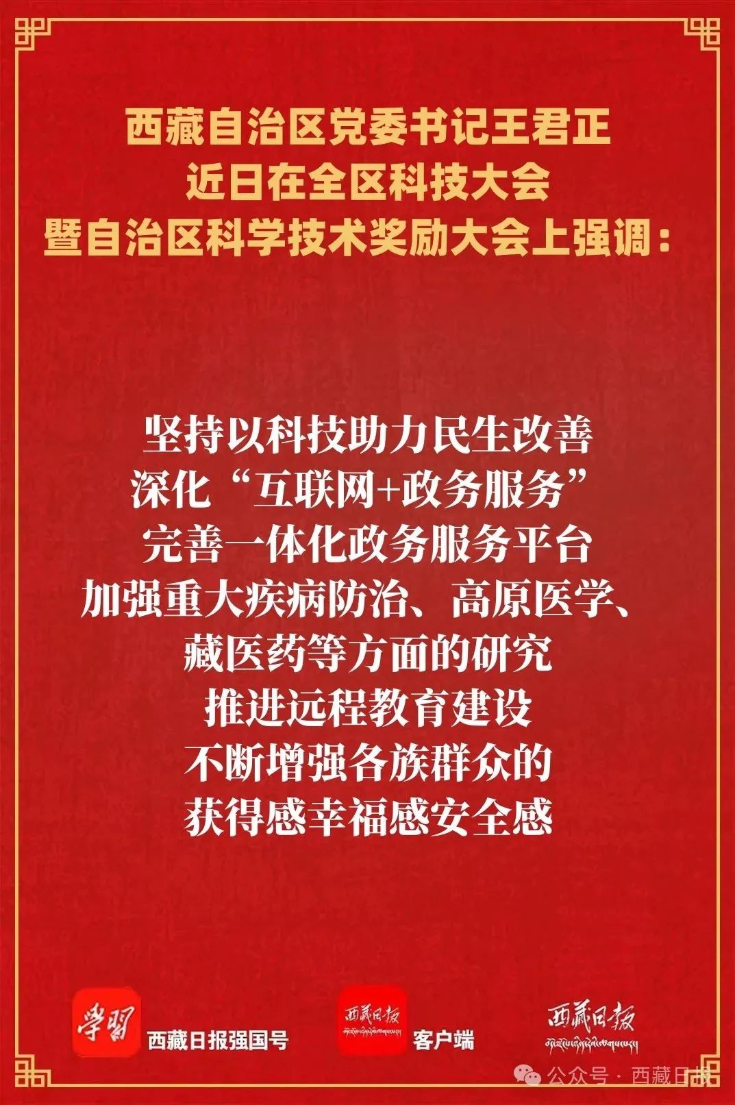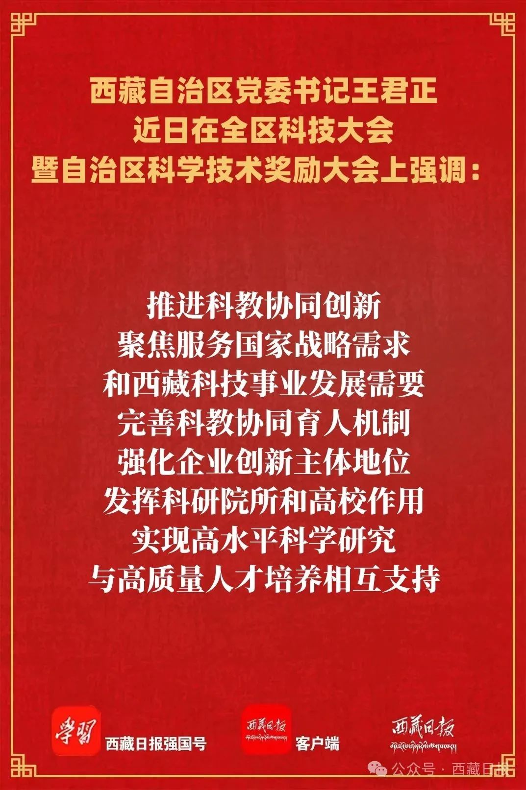 近日,全區(qū)科技大會(huì)暨自治區(qū)科學(xué)技術(shù)獎(jiǎng)勵(lì)大會(huì)在拉薩召開(kāi),自治區(qū)黨委書(shū)記王君正出席并講話(huà)。他強(qiáng)調(diào),要深入貫徹落實(shí)習(xí)近平總書(shū)記關(guān)于科技創(chuàng)新、西藏工作的重要指示和新時(shí)代黨的治藏方略,加快推動(dòng)科技事業(yè)發(fā)展,為社會(huì)主義現(xiàn)代化新西藏建設(shè)提供堅(jiān)實(shí)科技支撐。
