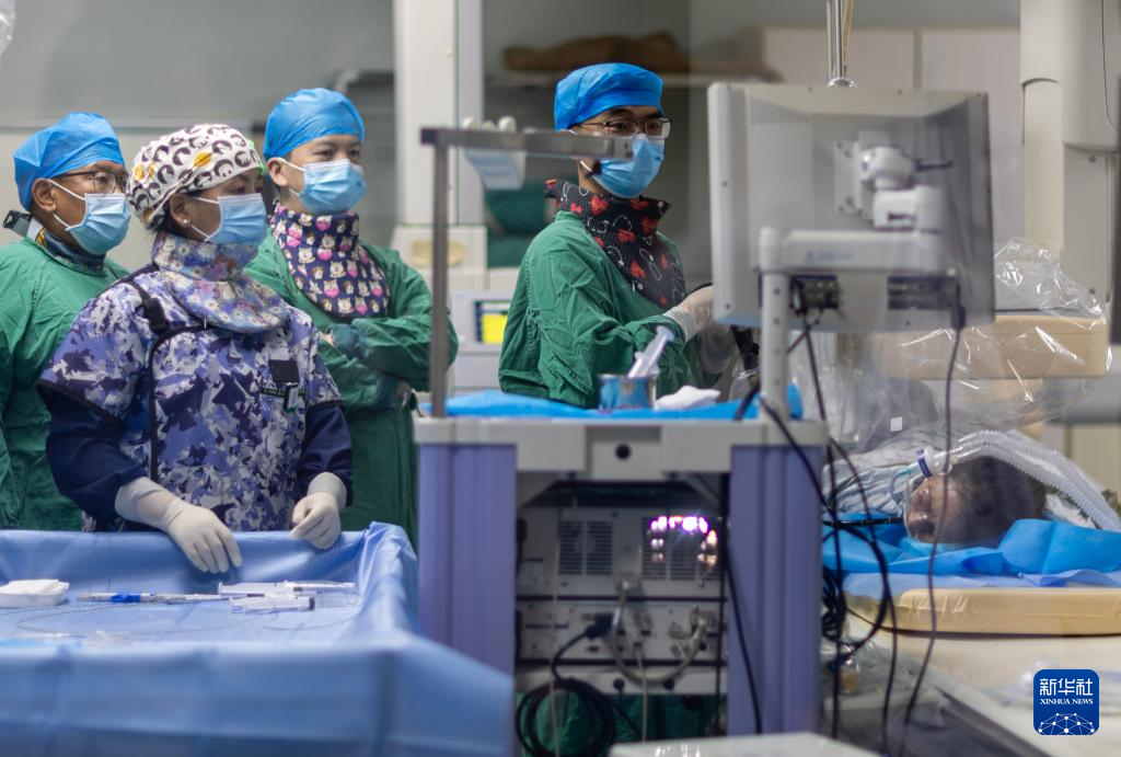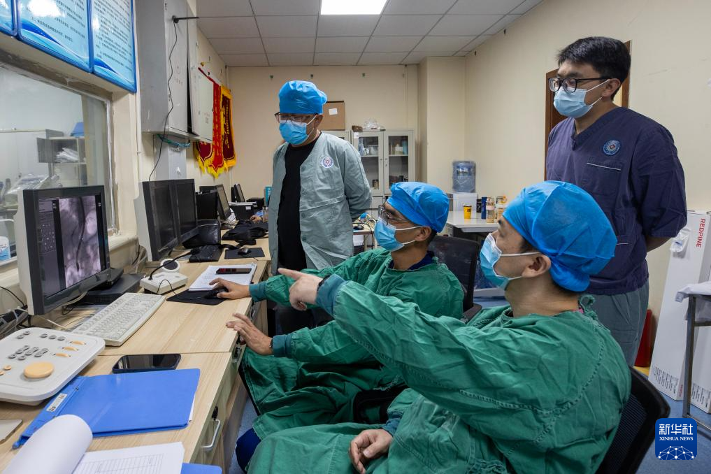 協(xié)和醫(yī)院第十批援藏醫(yī)生王強(左四)、第十一批援藏醫(yī)生蔣青偉(左三)和西藏自治區(qū)人民醫(yī)院醫(yī)生扎西(左一)在拉薩為患者施行內鏡逆行胰膽管造影術(8月5日攝)。新華社記者 姜帆 攝