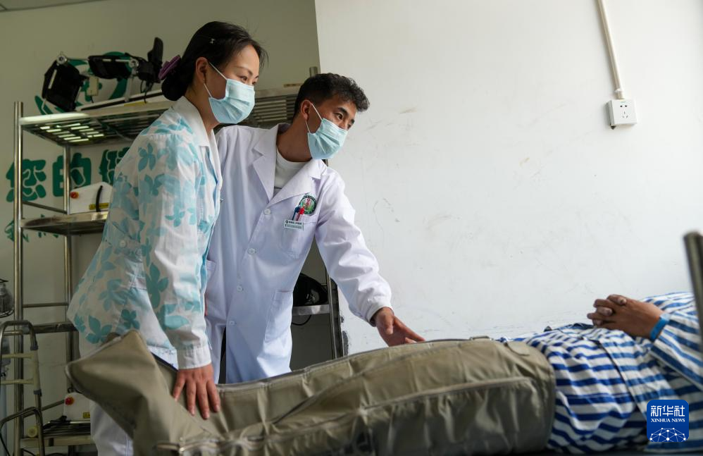 在昌都市洛隆縣人民醫(yī)院,從西藏大學醫(yī)學院畢業(yè)的醫(yī)生巴桑扎西和護士為患者進行康復治療(7月21日攝)。新華社記者 晉美多吉 攝
