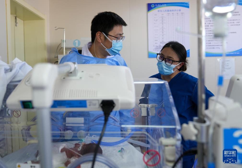 在那曲市人民醫(yī)院新生兒重癥監(jiān)護室,來自大連醫(yī)科大學附屬第一醫(yī)院的援藏醫(yī)生田聰亮(左)和護士旦珍合作為一名早產兒實施機械通氣治療(7月18日攝)。新華社記者 晉美多吉 攝