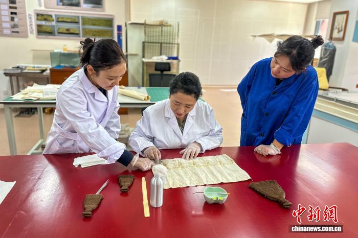 2025年7月9日,達(dá)珍(左一)在西藏大學(xué)古籍修復(fù)室為2024級(jí)中國(guó)古典文獻(xiàn)學(xué)(藏)學(xué)碩士研究生指導(dǎo)古籍修復(fù)。(受訪者供圖)