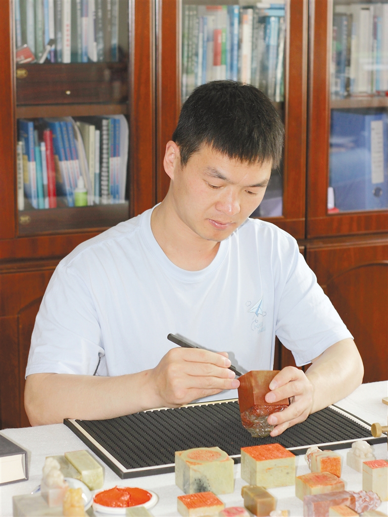 徐帥正認真篆刻作品。