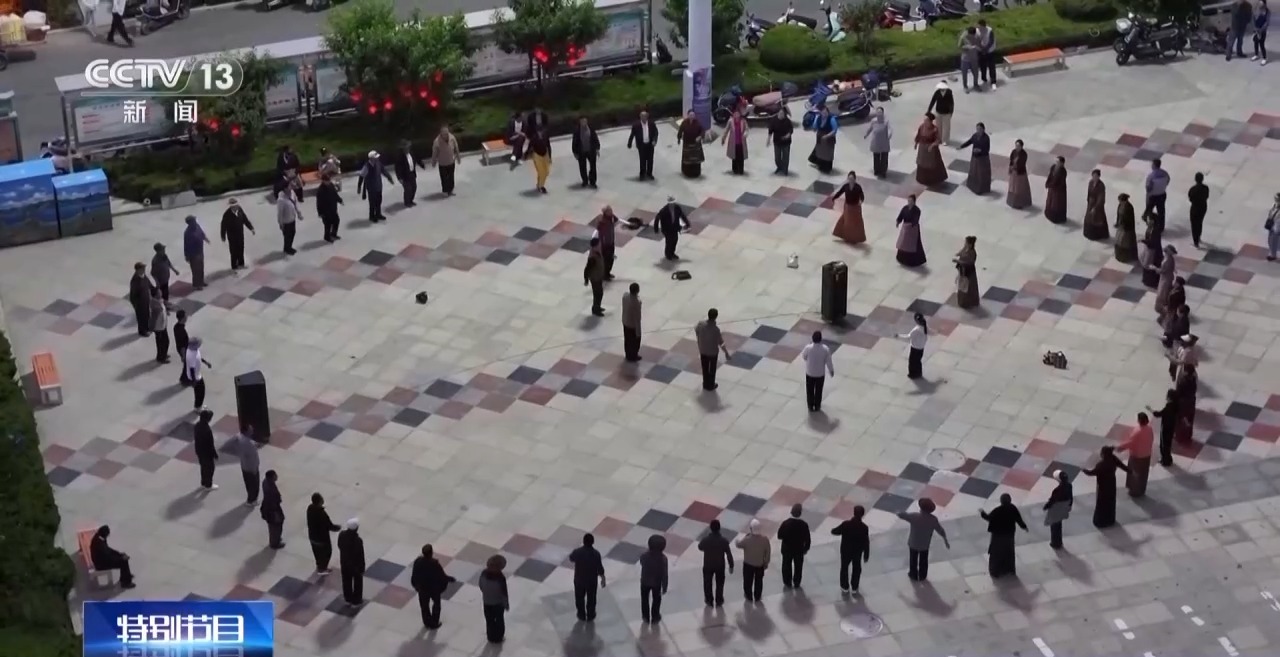 傍晚時分,社區(qū)居民吃過晚飯就會來到廣場,圍在一起跳起藏式廣場舞“鍋莊”。