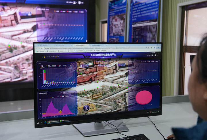 在布達(dá)拉宮監(jiān)測中心,工作人員正忙著通過數(shù)字化平臺(tái),實(shí)時(shí)監(jiān)控布達(dá)拉宮的“一磚一瓦”。