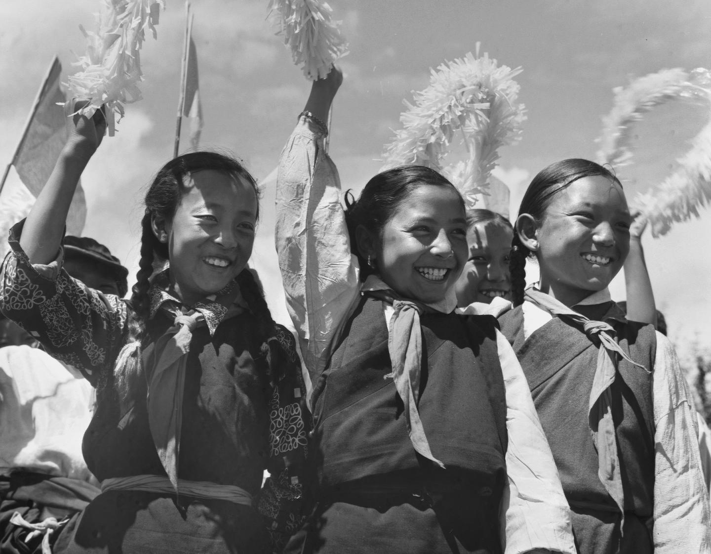 1965年9月,藏族兒童在西藏自治區(qū)成立大會上歡呼。新華社記者 馬競秋 攝