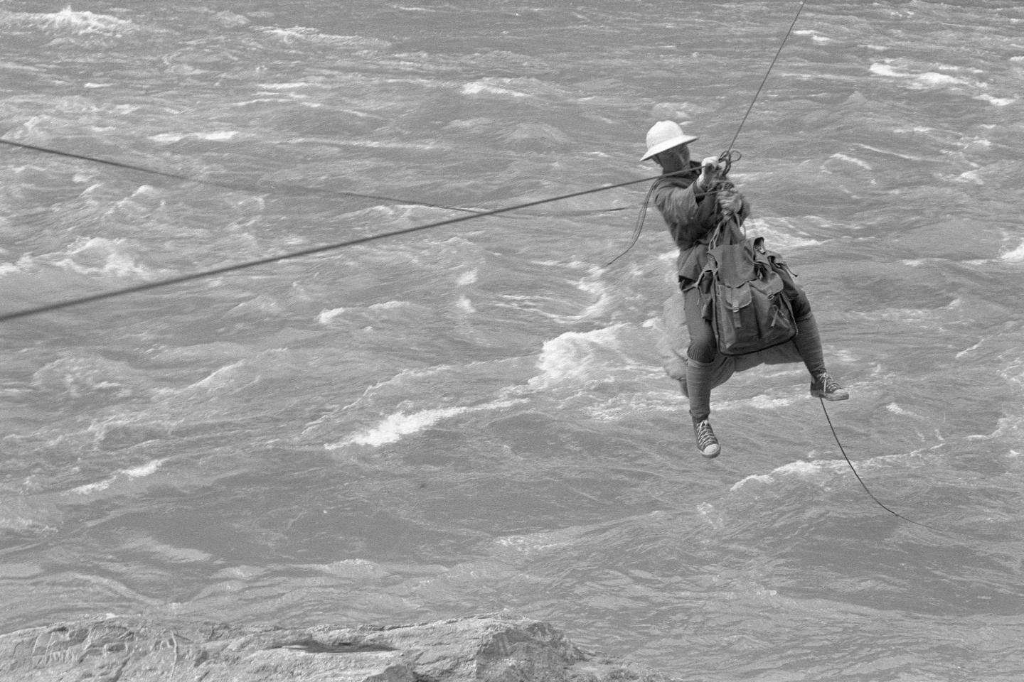 1983年,西藏林業(yè)局考察隊員通過雅魯藏布江上的溜索過江。新華社記者 土登 攝