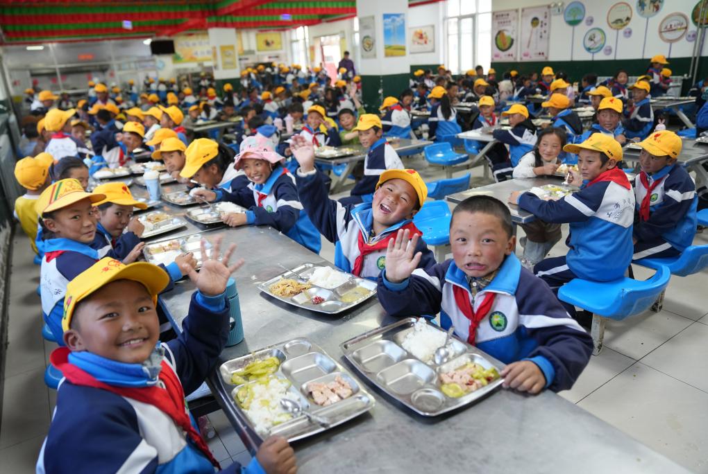 2024年9月3日,西藏林芝市工布江達縣娘蒲鄉(xiāng)中心小學的學生們在享用午餐。新華社記者 晉美多吉 攝