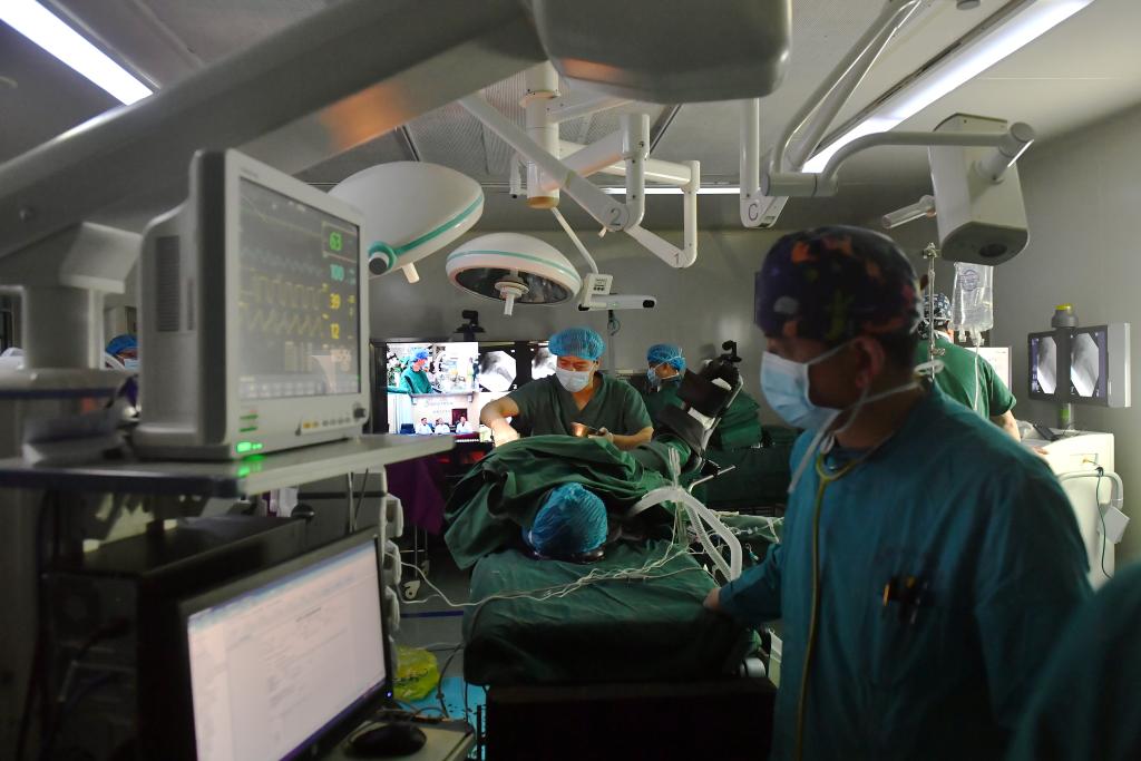 2021年4月19日,拉薩市人民醫(yī)院骨科醫(yī)生在北京積水潭醫(yī)院專家遠程指導下使用骨科機器人開展骨科手術(shù)。 新華社記者 孫瑞博 攝