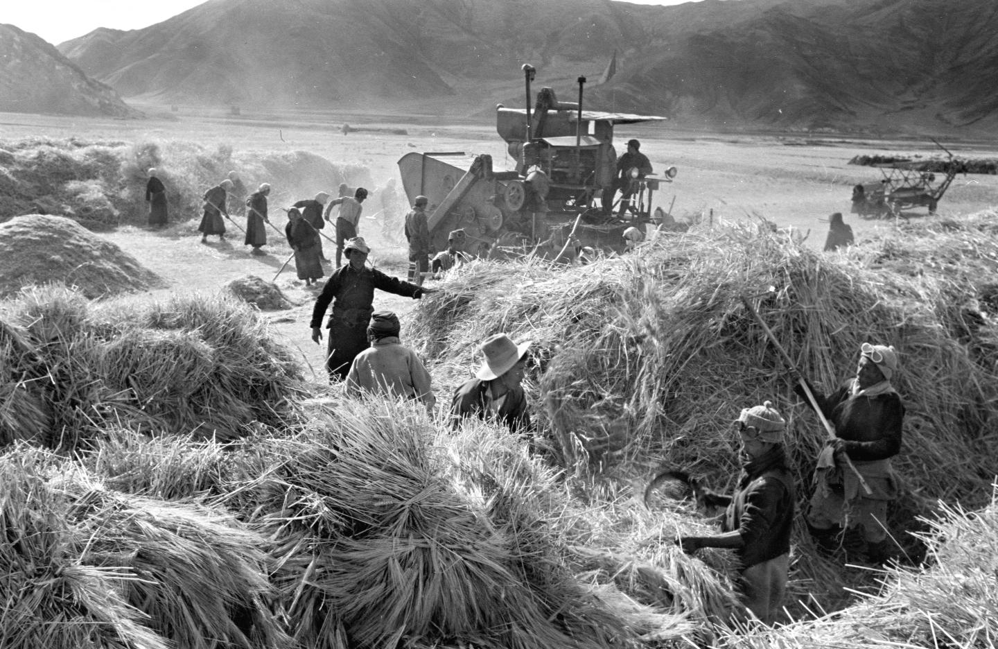 1965年,西藏國營澎波農(nóng)場的藏族工人在使用農(nóng)機脫粒。新華社記者 吳祖政 攝