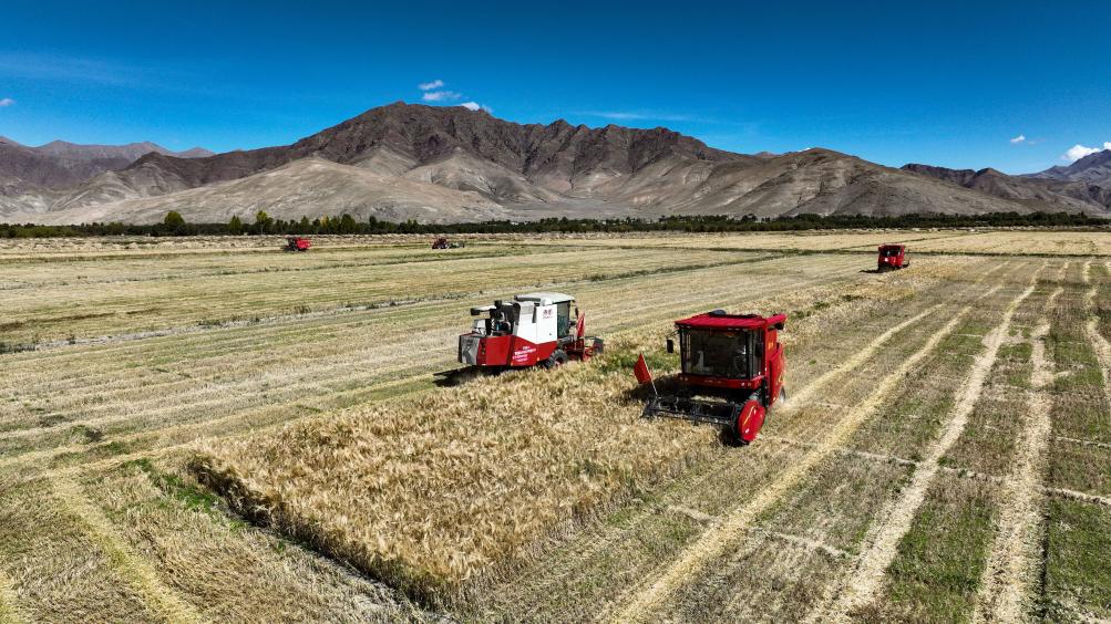 2022年9月19日,西藏日喀則市江孜縣熱索鄉(xiāng)努康村農(nóng)機合作社的村民集中對村里三千多畝耕地進行機械化收割。新華社記者 晉美多吉 攝
