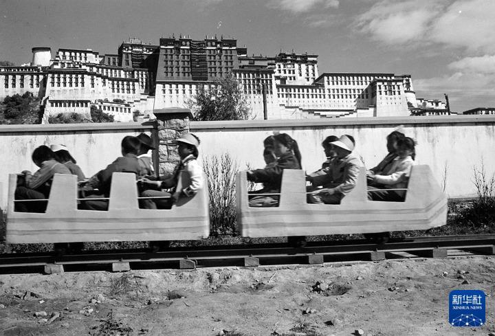 1987年10月1日,在拉薩勞動(dòng)人民文化宮內(nèi)新建成的大型游樂(lè)場(chǎng)里,小朋友們?cè)诔俗妱?dòng)小火車(chē)。