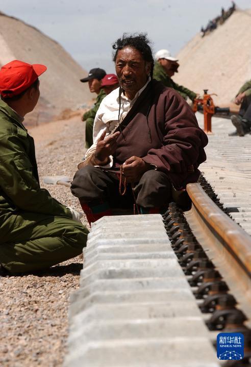 2004年6月20日,第一次見(jiàn)到鐵軌的當(dāng)?shù)夭刈迦罕娕c施工人員在交流。
