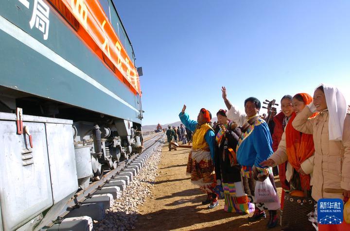 2004年10月10日,藏北群眾迎接火車(chē)抵達(dá)那曲。10月9日,青藏鐵路安多至那曲138公里鐵軌鋪設(shè)完成。10月10日,從安多出發(fā)的、西藏境內(nèi)第一列火車(chē),于上午10時(shí)抵達(dá)當(dāng)時(shí)的藏北重鎮(zhèn)——那曲鎮(zhèn)。