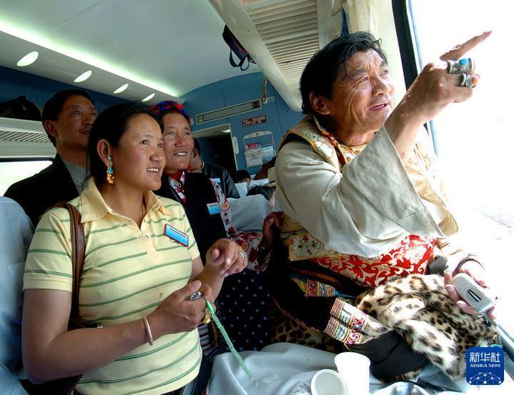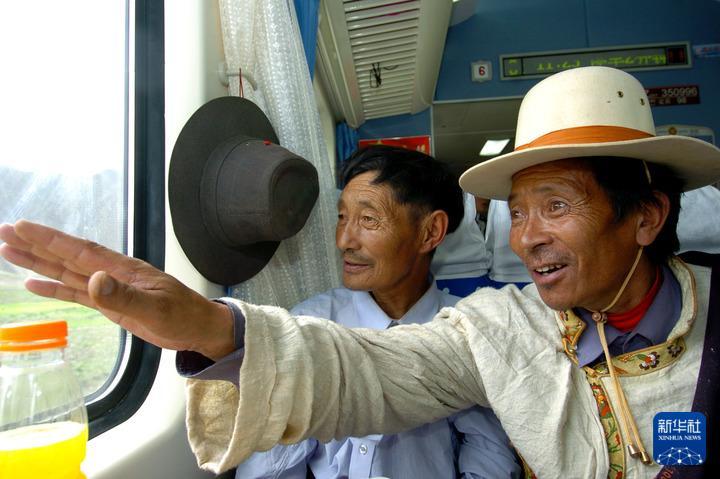 2006年7月1日,烏金(右一)乘坐的“藏2”次列車(chē)經(jīng)過(guò)自己家鄉(xiāng)安多時(shí),興奮地指向車(chē)外,向同伴介紹。