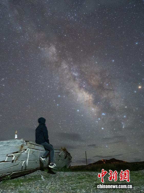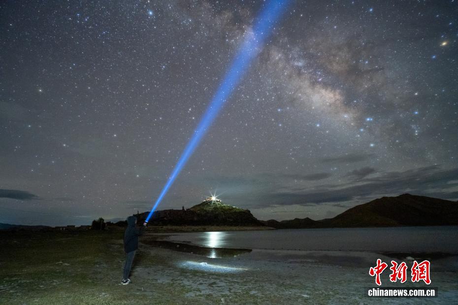 西藏山南羊卓雍錯(cuò)日托寺,因?yàn)楹0胃?、遠(yuǎn)離城市光污染,是理想的觀星之地。近日,海拔4400多米的寺廟夜空清澈,銀河清晰可見,璀璨星辰與羊卓雍錯(cuò)相映成趣,吸引游客和攝影愛好者觀星拍攝。圖為游客在羊卓雍錯(cuò)日托寺附近與銀河“打卡”。江飛波 攝