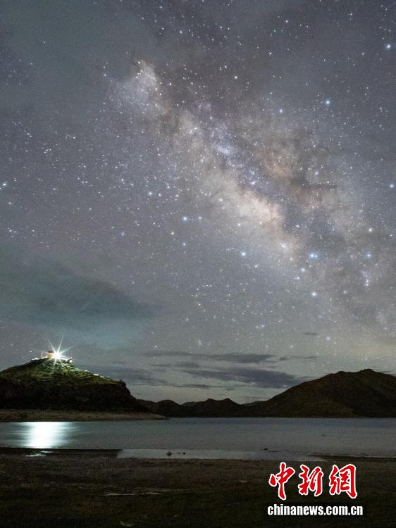 西藏山南羊卓雍錯(cuò)日托寺,因?yàn)楹0胃摺⑦h(yuǎn)離城市光污染,是理想的觀星之地。近日,海拔4400多米的寺廟夜空清澈,銀河清晰可見,璀璨星辰與羊卓雍錯(cuò)相映成趣,吸引游客和攝影愛好者觀星拍攝。圖為日托寺(燈光處)上空銀河璀璨。江飛波 攝