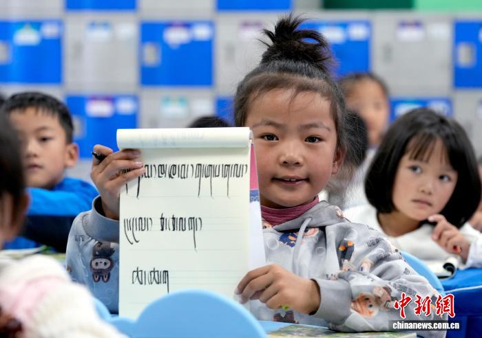 9月1日,拉薩市第一小學(xué)一年級(jí)二班的學(xué)生展示在藏語(yǔ)文課上書寫的藏文。近日,西藏拉薩市秋季學(xué)期開學(xué),各項(xiàng)教學(xué)工作有序開展。中新社記者 李林 攝