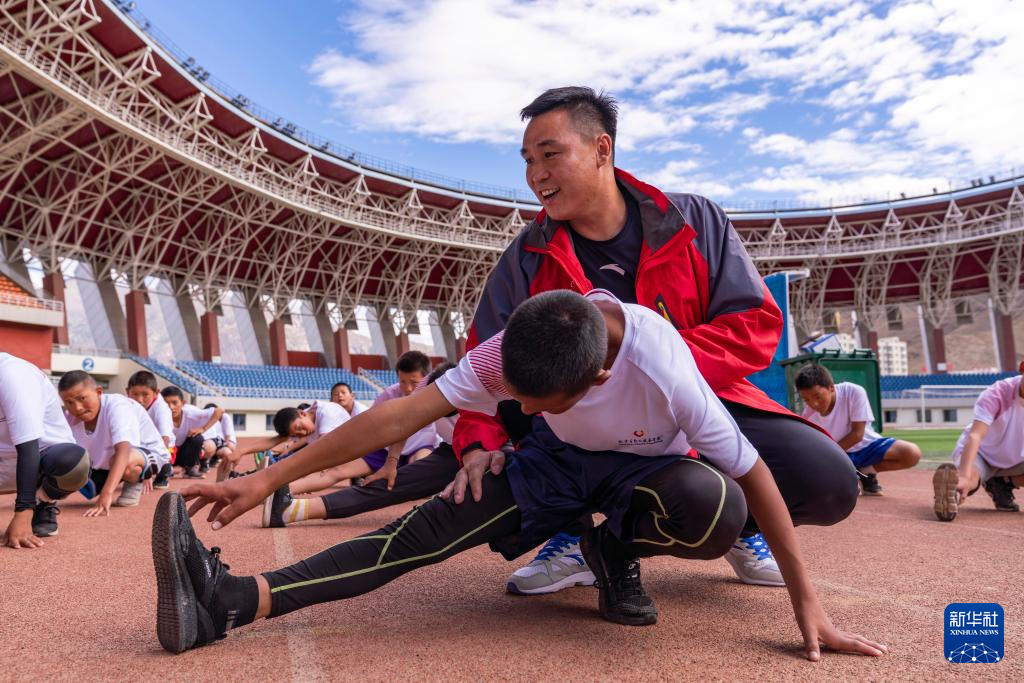資料圖片:2019年6月22日,摔跤奧運冠軍張小平和競走奧運冠軍王麗萍在西藏自治區(qū)拉薩市文化體育中心為拉薩市業(yè)余體校的小運動員們上了一節(jié)訓練課。圖為拳擊奧運冠軍張小平正在指導小運動員的壓腿動作。新華社記者 孫非 攝