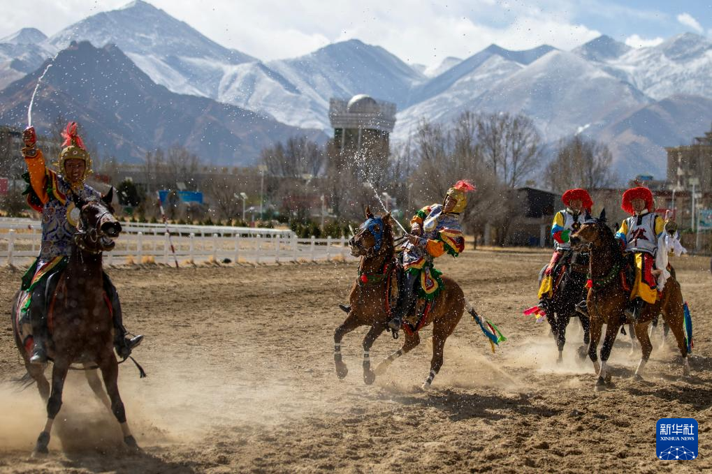 3月2日,2025年藏歷新年初三民族傳統(tǒng)馬術表演暨民族賽馬活動在拉薩市北郊賽馬場舉行。圖為馬術隊員在表演后慶祝。新華社記者 姜帆 攝