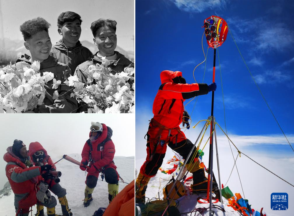 拼版照片:左上圖為1960年5月登上珠穆朗瑪峰頂?shù)闹袊巧疥犼爢T王富洲(右)、貢布(中)和屈銀華(資料照片 新華社發(fā));左下圖為2008年5月8日,北京奧運圣火珠峰傳遞登山隊隊員羅布占堆(左)點燃第一棒火炬手吉吉手中的“祥云”火炬(新華社發(fā));右圖為2020珠峰高程測量登山隊隊員在珠穆朗瑪峰峰頂開展測量工作(2020年5月27日新華社特約記者扎西次仁攝)。新華社發(fā)
