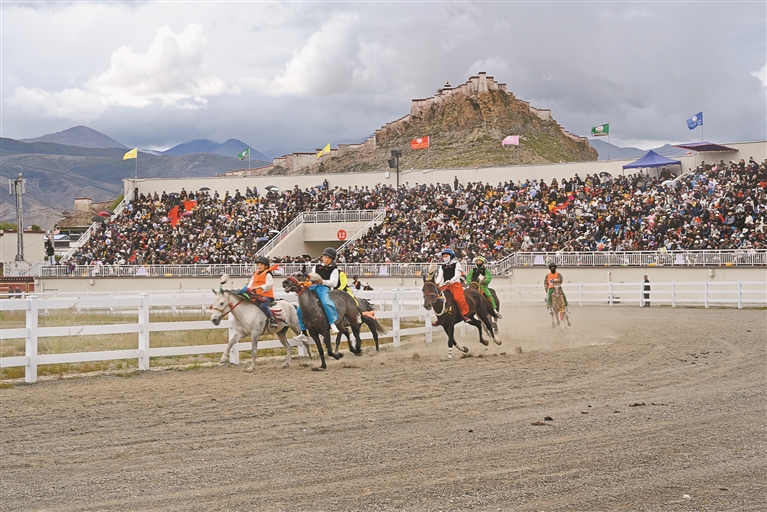 開幕式上,100位騎手策馬奔騰,繞場致意。隨后,擊鼓迎賓、紅色鼓陣、車仁望果、千年名城、英雄江孜、青稞之鄉(xiāng)等10個方隊和來自各鄉(xiāng)鎮(zhèn)的賽馬隊依次入場,全方位、多角度展示了江孜縣特色產(chǎn)業(yè)興旺、基礎(chǔ)設(shè)施提升、民生持續(xù)改善的美好圖景,展現(xiàn)了新時代英雄城兒女堅韌不拔、昂揚向上的精神風(fēng)貌,深情表達了江孜人民對黨的無限感恩、對祖國的無限熱愛、對西藏繁榮發(fā)展的美好祝愿。