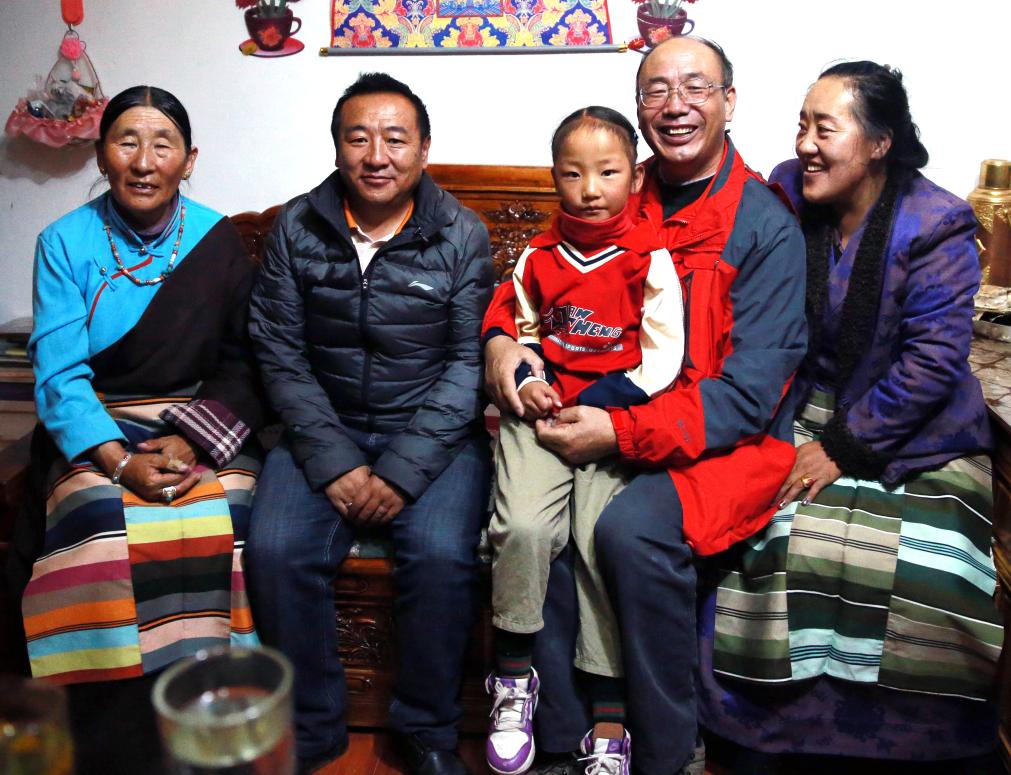 這是唐召明(右二)作為北京建藏援藏工作者協(xié)會志愿者到藏北草原向牧民群眾捐贈撿拾牛糞的高原撿拾車時,前去看望次仁石達(dá)(左二)一家,并與次仁石達(dá)的女兒小拉姆(中)以及阿媽達(dá)曲(左一)合影留念(王博軒2019年9月9日攝)