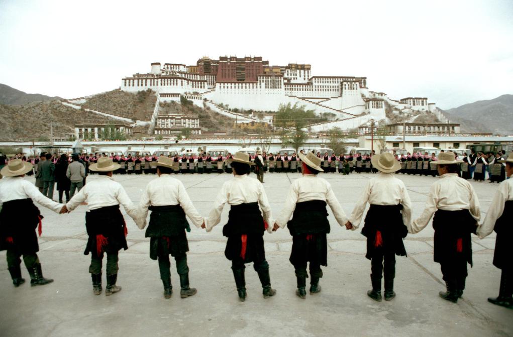 在拉薩市布達(dá)拉宮前,兩位身著藏裝的外國游客和一位藏族婦女交談。交通和旅游服務(wù)設(shè)施的逐步完善,為獨具風(fēng)情的西藏高原引來了更多的游客。(1997年11月13日發(fā))