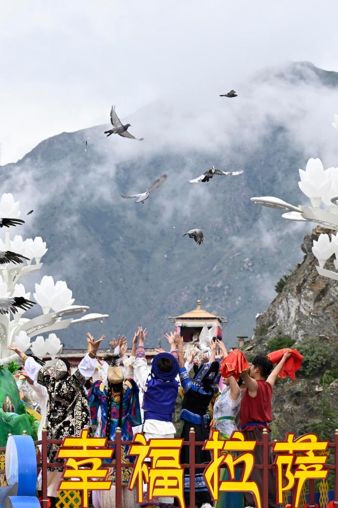 2025年8月21日上午,西藏各族各界干部群眾約2萬人歡聚拉薩市布達(dá)拉宮廣場,熱烈慶祝西藏自治區(qū)成立60周年。這是彩車上的演員通過布達(dá)拉宮廣場時放飛鴿子。新華社記者 申宏 攝