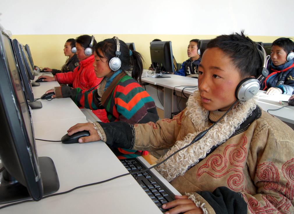 由中海油援建的尼瑪縣小學(xué)學(xué)生在上計算機課(2009年9月13日攝)。