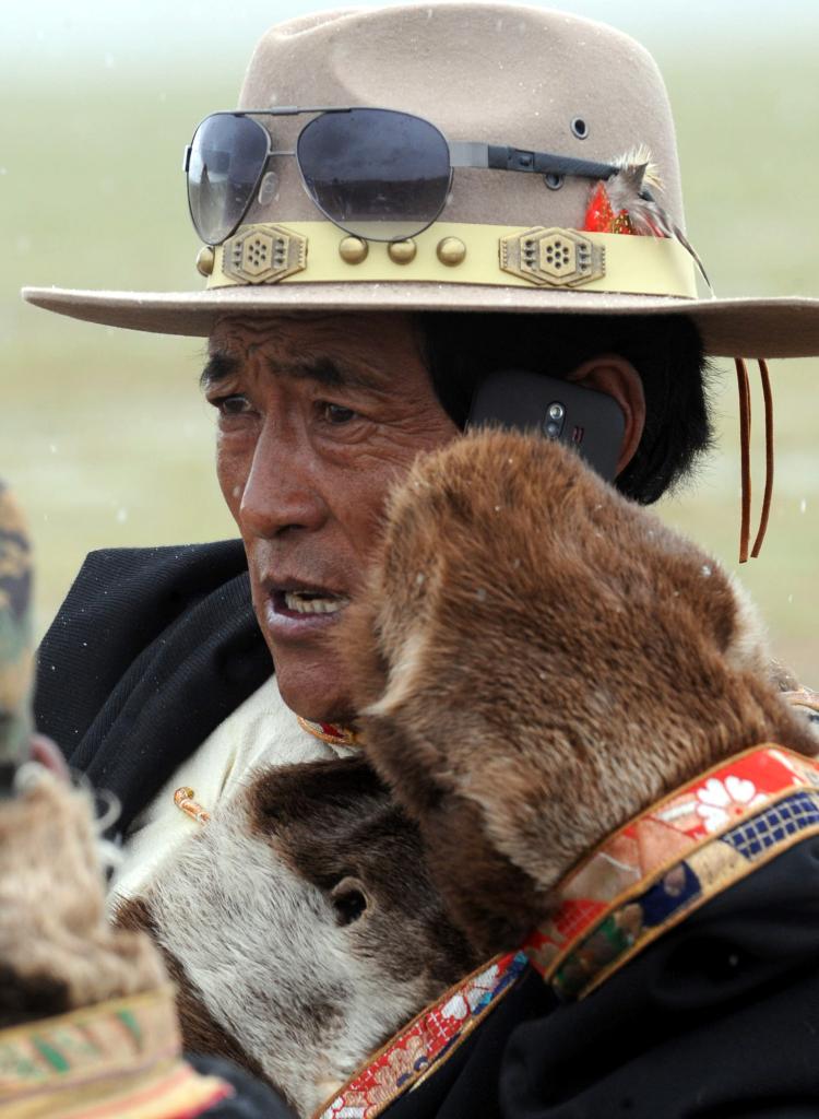 這是雙湖縣一位牧民使用手機打電話(2013年7月27日攝)。